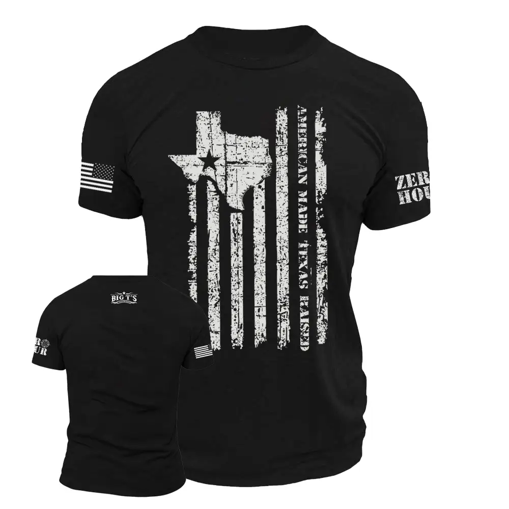 Front: Striking distressed American flag with Texas outline integrated into the stripes, flanked by vertical text reading “AMERICAN MADE, TEXAS RAISED” – a powerful fusion of state and national pride