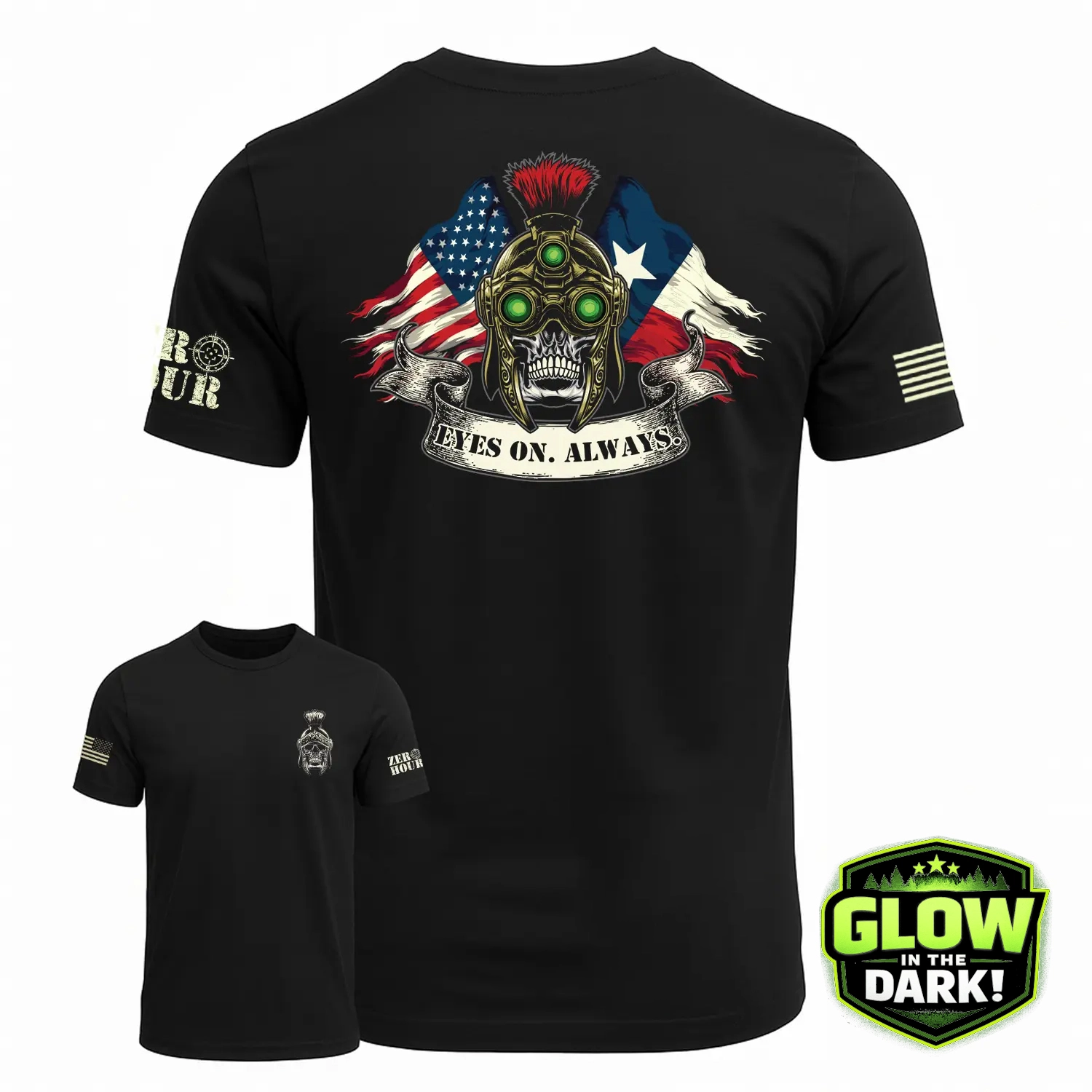 Featuring a battle-worn Spartan skull with glowing night-vision optics (glow in the dark), framed by the American and Texas flags, this design represents vigilance, sacrifice, and the warrior mindset that never shuts off.
