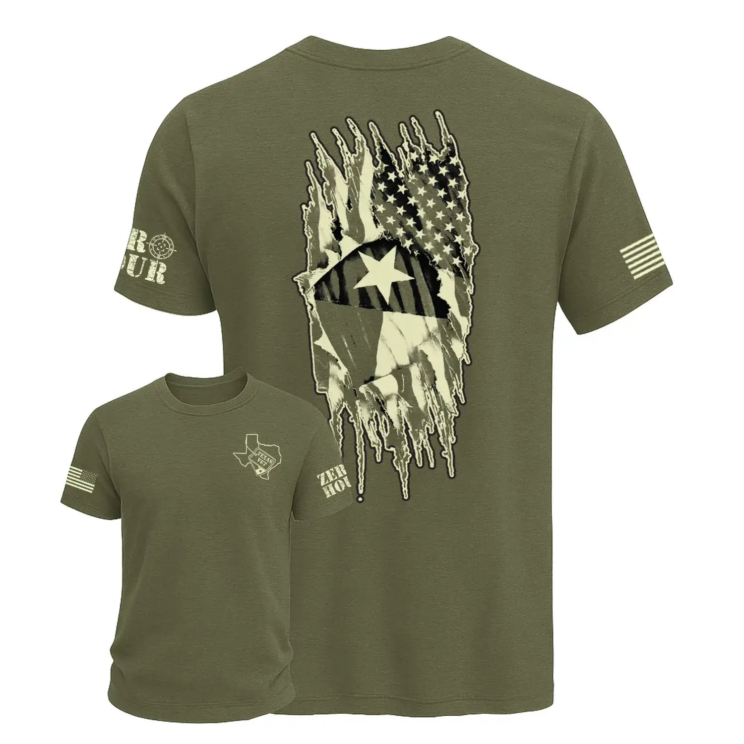 Back: Powerful American flag tearing open to reveal the Texas flag beneath – distressed like battle-worn canvas but standing strong, symbolizing the unbreakable bond between country and state