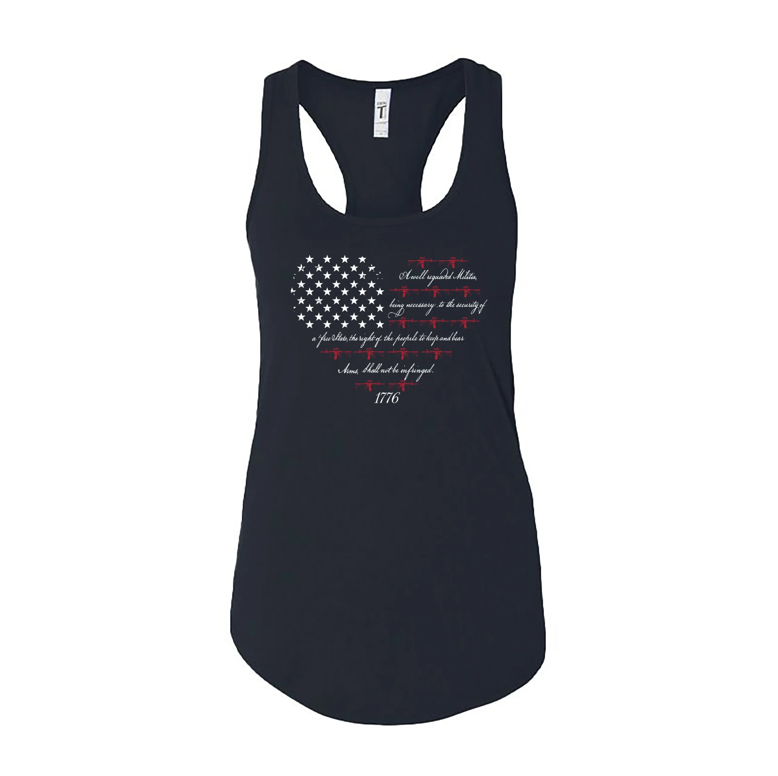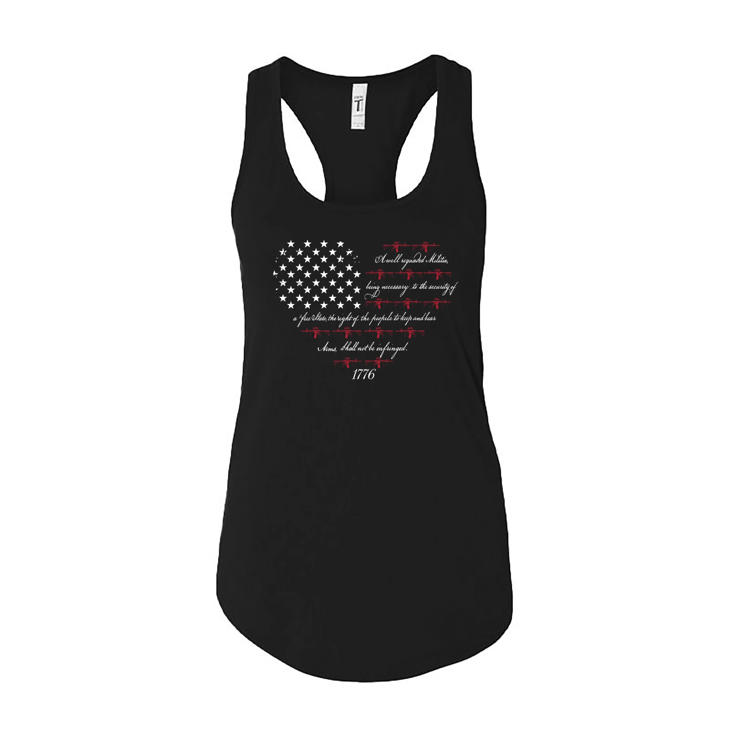 Embrace your constitutional rights with our Women’s 2nd Amendment Heart Tank. This navy blue racerback features a unique heart-shaped graphic blending the iconic stars of the American flag with the full text of the Second Amendment. Distressed red rifle silhouettes form the “stripes,” creating a bold statement piece for any patriotic wardrobe.