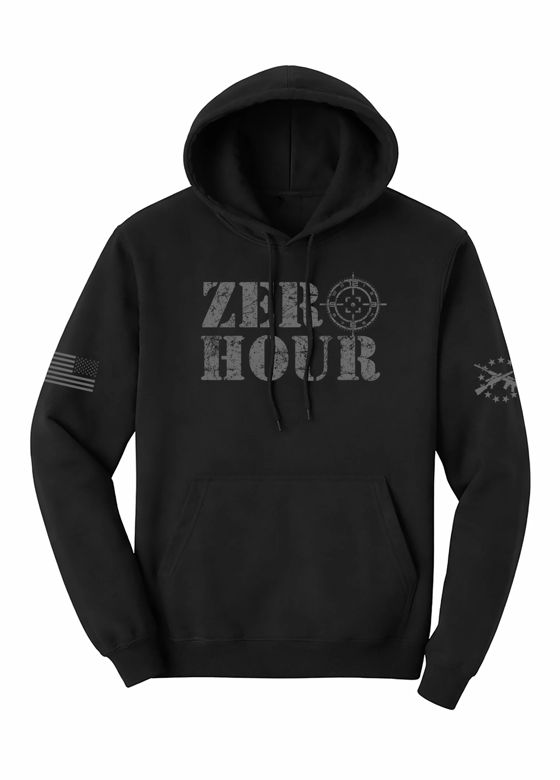 The Zero Hour Blackout Hoodie was designed for patriots, veterans, first responders, and everyday Americans who believe readiness is a mindset. Featuring a stealth blackout colorway and distressed Zero Hour chest print, this hoodie delivers a clean, aggressive look that stands up in the street, the range, or the grind of everyday life.
